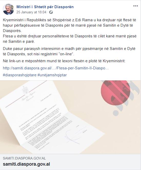Kryeministri Rama u ka drejtuar një ftesë të hapur përfaqësuesve të Diasporës për të marrë pjesë në Samitin e Dytë të Diasporës.
