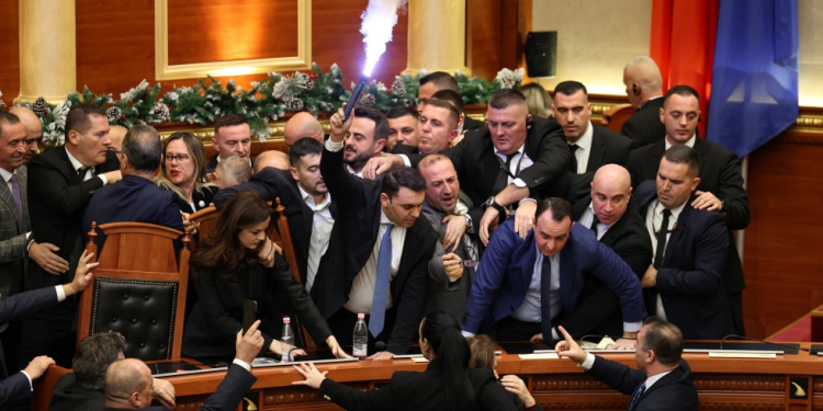The Independent: Ligjvënësit opozitarë kanë shkulur mikrofonët, kanë hedhur shishe uji dhe kanë ndezur flakadanë, duke akuzuar Partinë Socialiste për korrupsion.