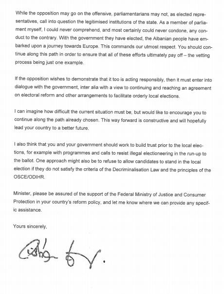 Gjatë takimit tonë në Tiranë, ju më latë përshtypjen e një mbrojtëse të përkushtuar ndaj vendit tuaj dhe ndaj reformave që duhen bërë në fushën e drejtësisë, po ashtu jam i ndërgjegjshëm për punën e madhe që keni bërë ju, Ministria juaj dhe institucionet e drejtësisë në interes të vendit tuaj dhe rrugën që keni ndërmarrë drejt Europës. Pas tërë punës dhe mundimeve, që ne në Gjermani kemi ndihmuar t’i mbështesim përmes projektit EURALIUS, do të na vinte keq nëse Shqipëria nuk do të merrte një përgjigje pozitive për hapjen e negociatave.
