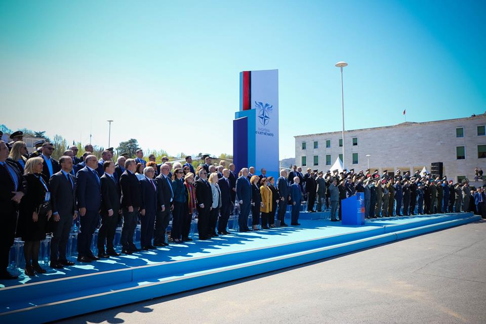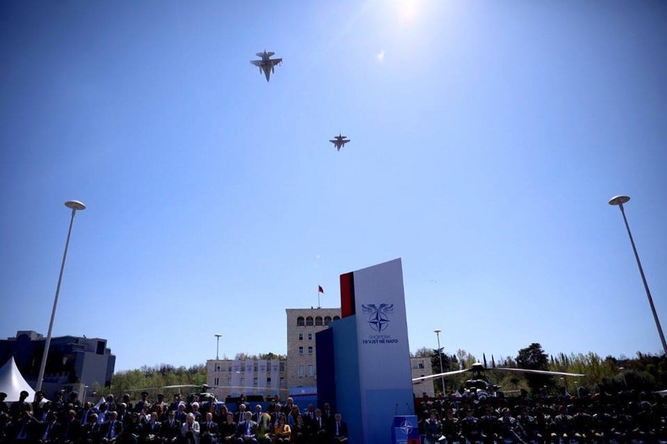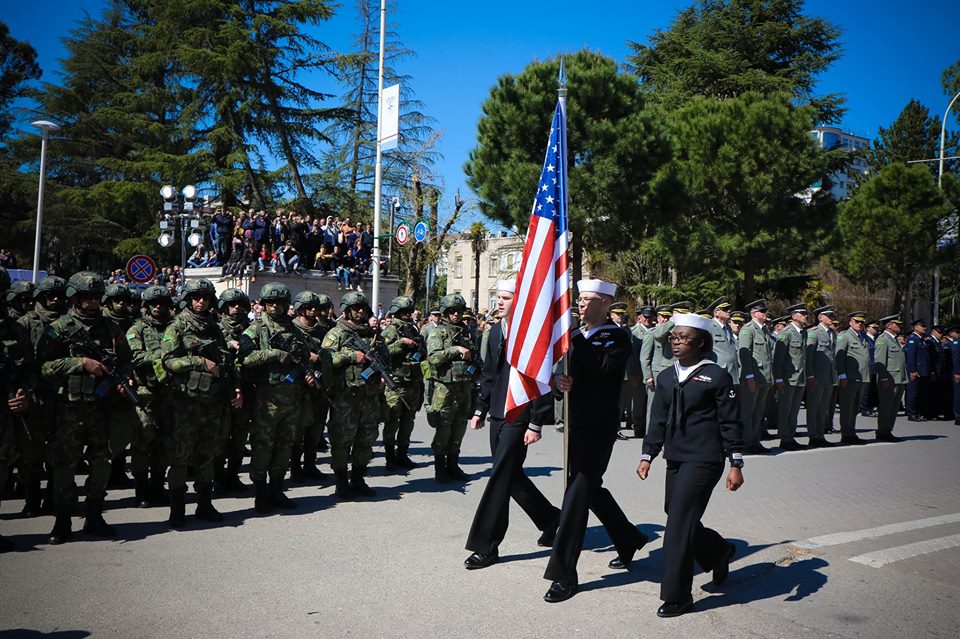 Ndërsa Shqipëria feston 10 vjet anëtarësim në NATO, ushtarët amerikanë marshuan me krenari përkrah Forcave të Armatosura të Shqipërisë, duke i qëndruar këtij premtimi. Edhe sot, Shqipëria mund të mbështetet tek Shtetet e Bashkuara, ashtu si Shtetet e Bashkuara mund të mbështeten tek Shqipëria. Gëzuar përvjetorin e 10-të, Shqipëri! #Shqiperia10Vjet #NeJemiNATO /a.meta