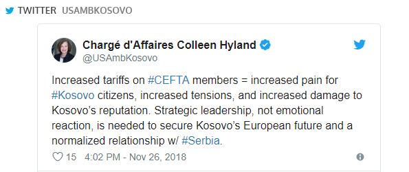 Ushtruesja e Detyrës së Ambasadores së Shteteve të Bashkuara të Amerikës në Kosovë, Colleen Hyland, e ka cilësuar si të dëmshme vendosjen e taksës së Kosovës ndaj produkteve të Serbisë. Sipas saj, rritja e taksave ndaj Serbisë nënkupton rritje të tensioneve dhe rritje të dëmtimit të reputacionit të Kosovës. Hyland ka thënë se duhet normalizuar marrëdhëniet me Serbinë.