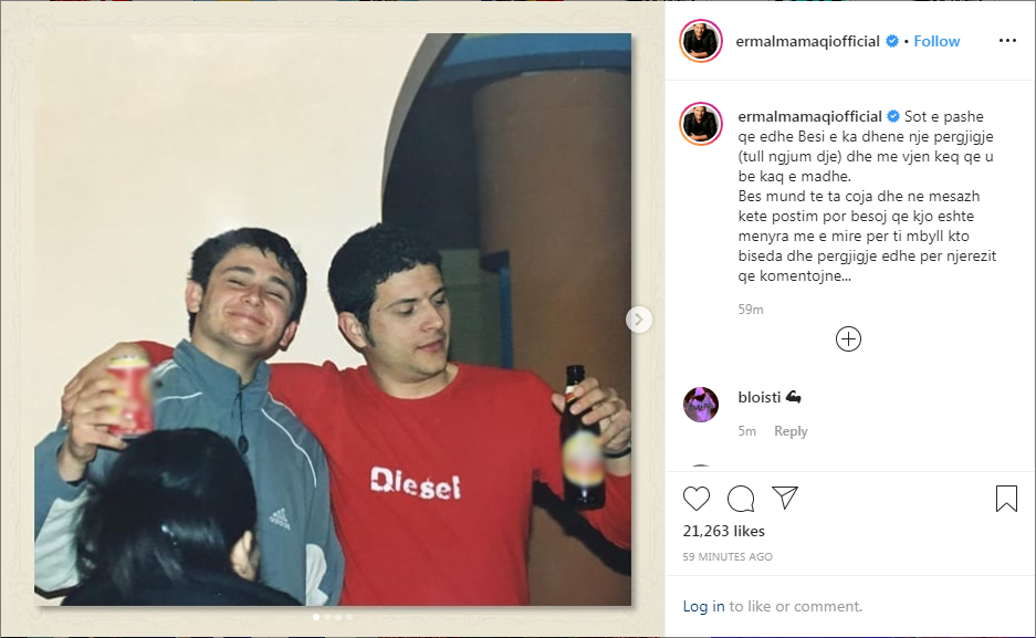 Duke e quajtur mik, Ermali flet për telefonatën që ka pasur me Besin, të cilën ky i fundit e ka përmendur në postimin e tij në Instagram.