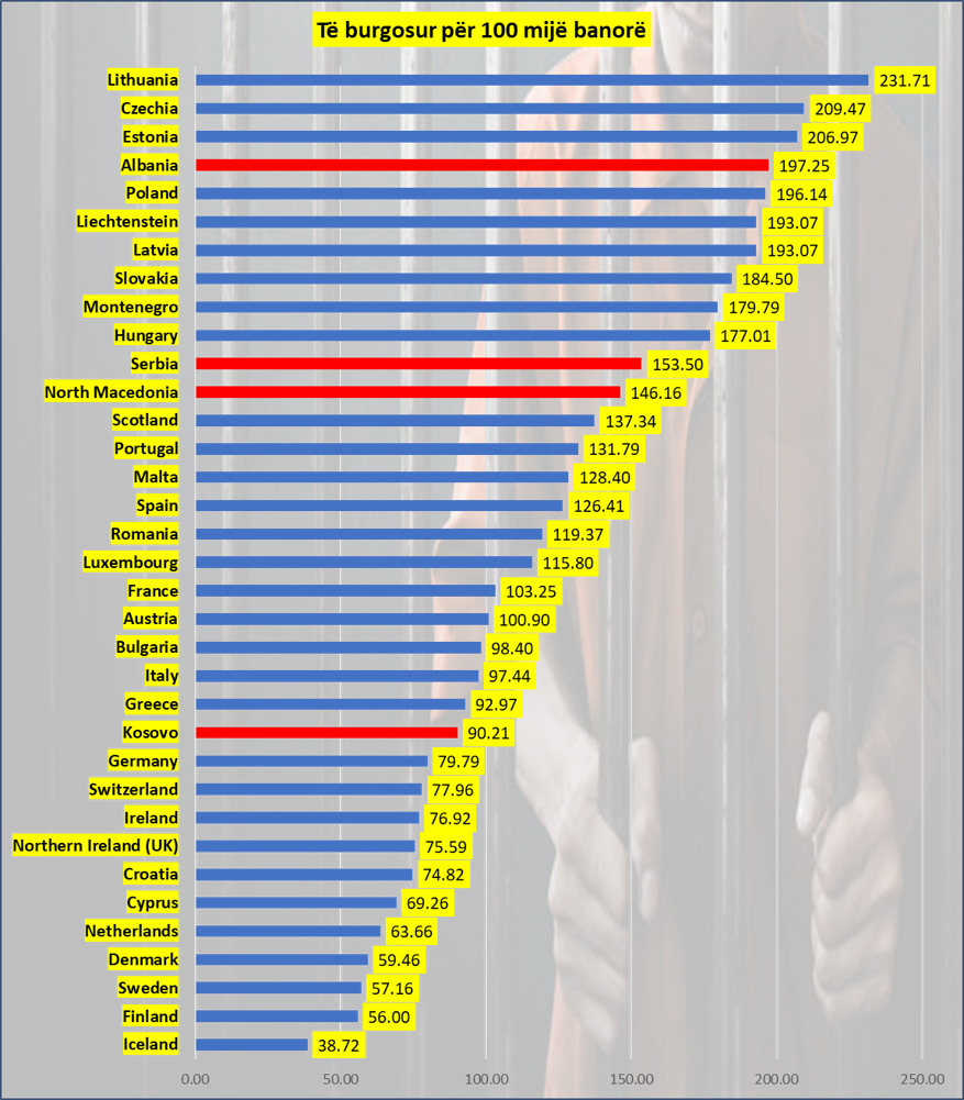 Shqipëria duket mban rekordin në Ballkanin Perëndimor dhe renditet ndër vendet me numrin më të lartë për sa i përket individëve të dënuar për veprat penale. Në raport me popullsinë, në Shqipëri kishte 197 të burgosur për çdo 100 mijë banorë që jetojnë këtu, duke u renditur e katërta në Europë, pas Lituanisë, Çekisë dhe Estonisë.