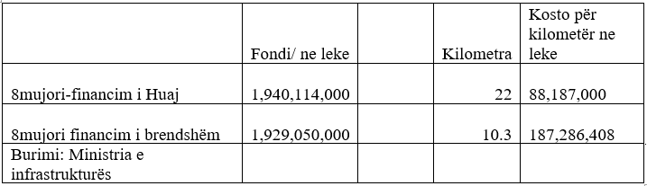 Sipas të dhënave zyrtare nga Ministria e Infrastrukturës, një kilometër rrugë e kategorisë B, me fonde të huaja, ka kushtuar 88,1 milionë lekë për kilometër, ndërsa me fonde të brendshme ka kushtuar 187 milionë lekë për kilometër, ose 112% më shumë.