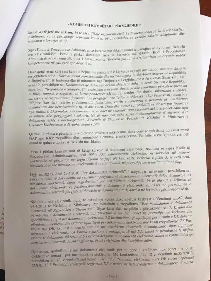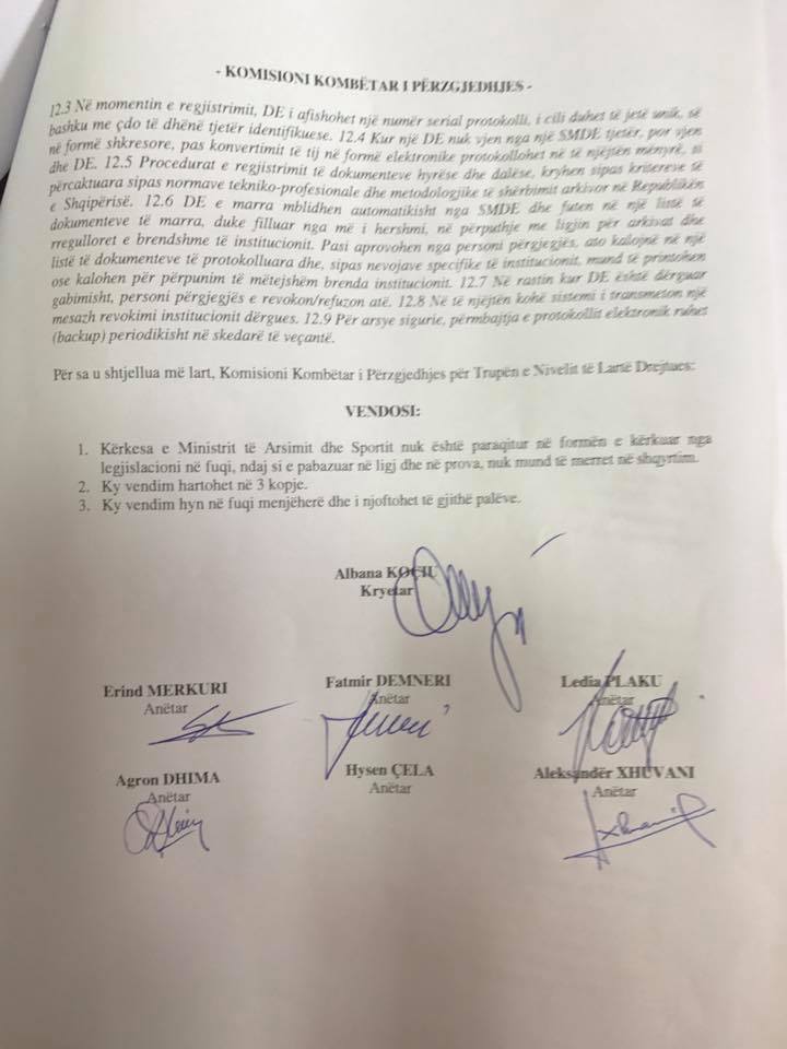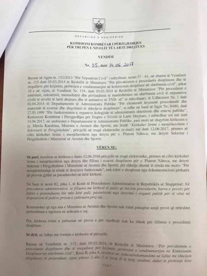 Vendimin për mosmarrjen në shqyrtim të kërkesës së Ministres Karabina e ka bërë publike vetë sekretari i Përgjithshëm Plarent Ndreca teksa nënvizon: “Ja prova e radhës e çmendurisë juridike, për të cilën fola dje…!”.