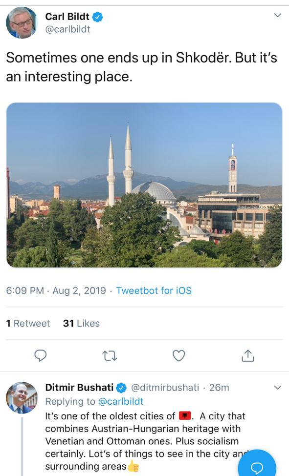 Nuk dimë nëse rastësisht, apo rrethanat e kanë çuar në një nga qytetet më të lashta të Shqipërisë, por vetë Bildt ka postuar një foto ku shkruan: “I ndodh njeriut të përfundojë në Shkodër. Por ia vlen është një qytet interesant”.