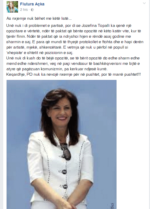 Në një postim në faqen e saj në FB, ajo reagon ashpër kundër vendimit të Bashës që la jashtë ish-kryeparlamentaren Jozefina Topalli dhe emra të tjerë të njohur të demokratëve.