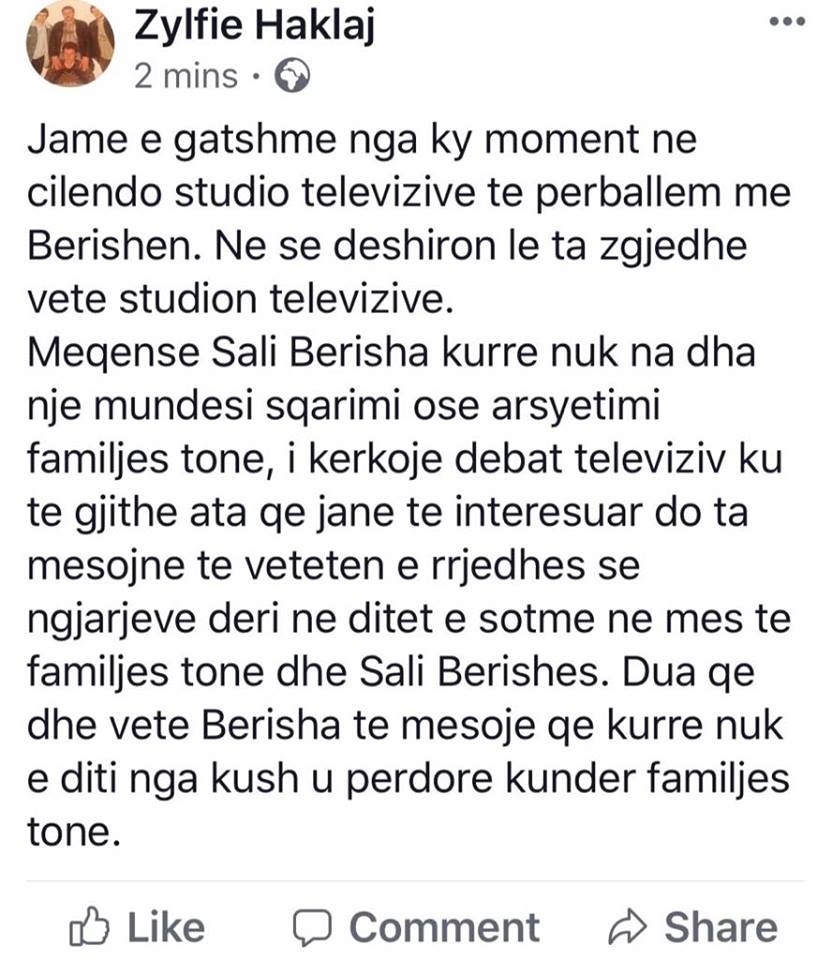 Dua qe dhe vete Berisha te mesoje qe kurre nuk e diti nga kush u perdore kunder familjes tone.”- shkruan motra e Haklajve në facebook.