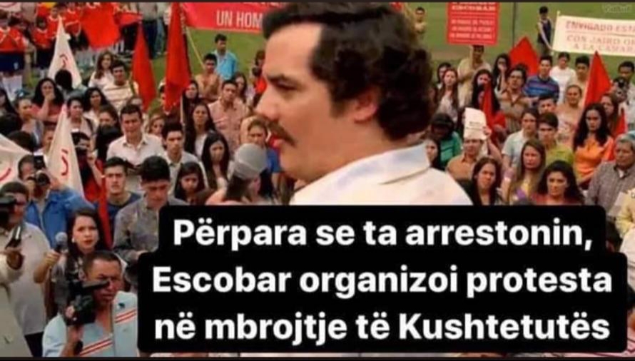 Me anë të një meme-je rrjetet sociale kujtojnë se si edhe famëkeqi i drogës Pablo Escobar realizonte protesta për të mbrojtur veten e tij. Duke bërë një paralelizim mes Escobarit si shkelës ligji dhe pasurie të paligjme dhe presidentit Meta, rrjetet sociale kanë publikuar memen e mëposhtme: