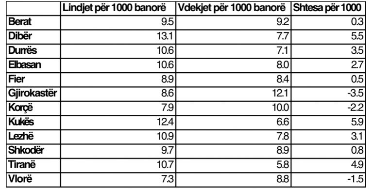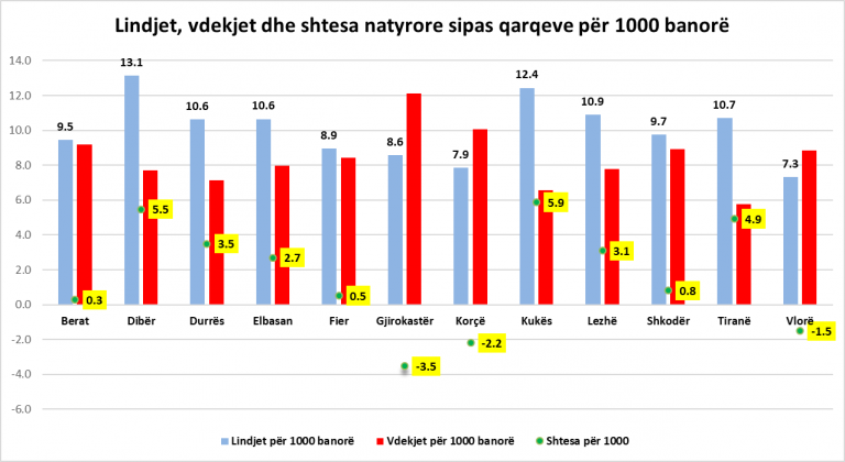 Lindjet më të larta u shënuan në qarkun e Dibrës, ku sipas tëdhënave të INSTAT dhe përllogaritjeve të Monitor ishin 13.1 lindje për 1000 banorë, ndërsa vdekjet 7.7. Shtesa natyrore nëqarkun e Dibrës është ndër më të lartat në vend me 5.5 për çdo 1000 banorë.