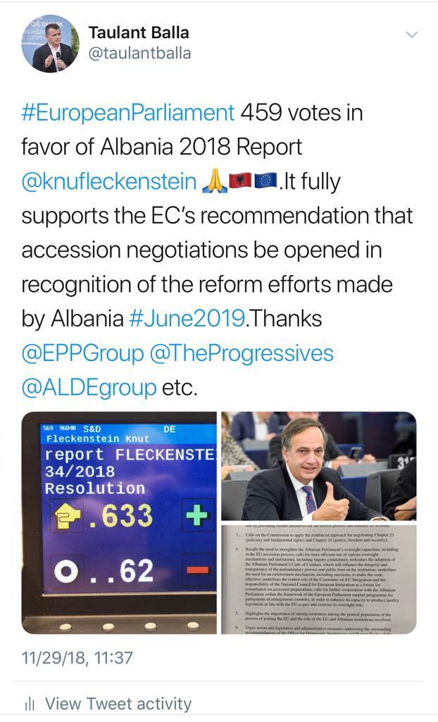 “Parlamenti Europian ka votuar me 459 vota pro në favor të raportit të vitit 2018 për Shqipërinë. Ky raport mbështet plotësisht rekomandimet e Komisionit Europian që lejon hapjen e negociatave në njohje të përpjekjeve për zbatimin e reformave të bëra nga Shqipëria”, shkruan Balla.