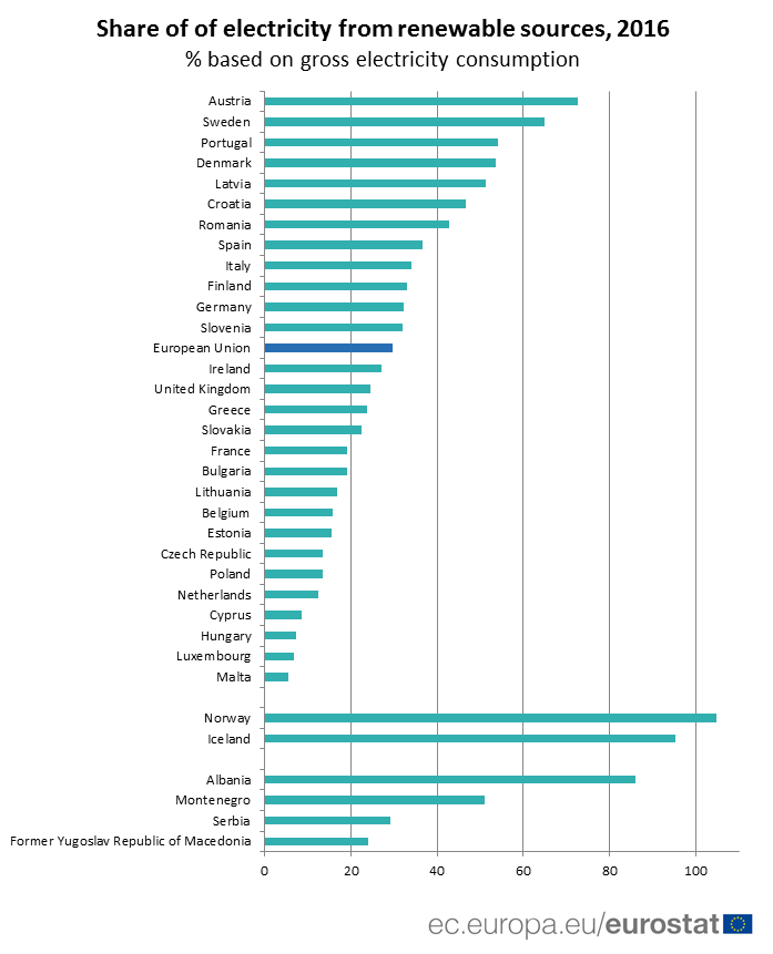 Sipas Eurostat, në pesë vende të BE, mbi 50% e energjisë elektrike të konsumuar në vitin 2016 ishte prodhuar nga burime të rinovueshme; Austria (73%), Suedia (65%), dhe Portugalia dhe Danimarka (54%).