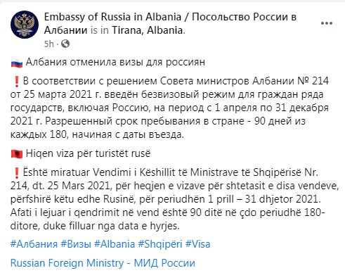 “Shqipëria anulon vizat për turistët rusë. Në përputhje me vendimin e Këshillit të Ministrave të Shqipërisë nr. 214 nga data 25 mars 2021, regjimi pa viza për qytetarët e një numri shtetesh, përfshirë Rusinë, është prezantuar për periudhën nga 1 prill deri më 31 dhjetor 2021. Rezidenca e lejuar në vend është 90 ditë nga çdo 180 ditë, duke filluar nga data e hyrjes.”- thuhet në njoftimin e ambasadës./ b.h