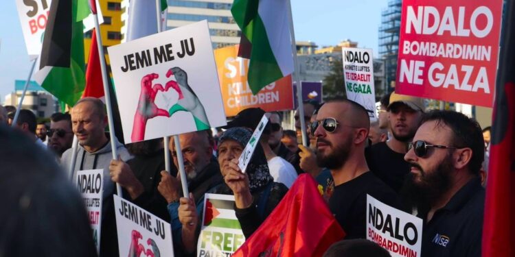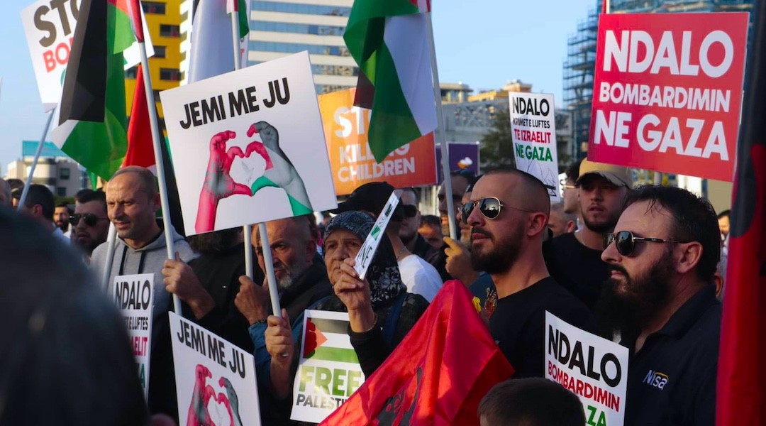 Të premten, qindra muslimanë shqiptarë u bashkuan në sheshin Skënderbeu, sheshi kryesor i Tiranës, duke bërtitur slogane pro-palestineze dhe duke tundur pankarta “Gaza e Lirë”.