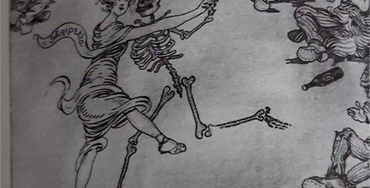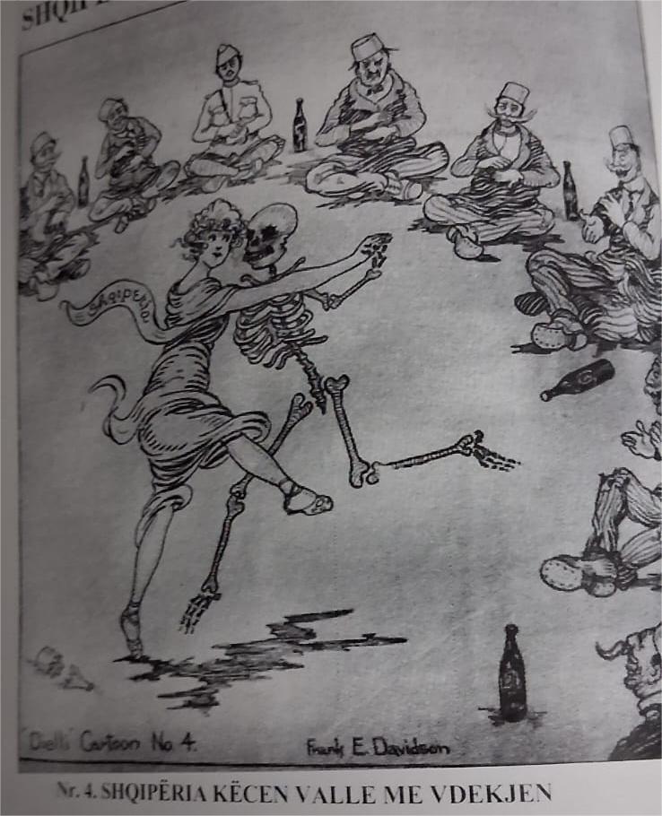 Është një karikaturë e gati një shekulli më parë, botuar tek “Dielli” më 17 Qershor të vitit 1922, tashmë e harruar, por që na flet me të njëjtin mesazh dhe ku madje mund t’i kuptosh mirë kohët tona. Quhet “Shqipëria këcen valle me vdekjen” dhe mban autorësinë e karikaturistit amerikan Frank E. Davidson. Ky i fundit i punësuar nga Konica në vitet ‘20 dhe i asistuar vazhdimisht prej tij për temat shqiptare ka përcjellë situata të jashtëzakonshme të shtetit tonë, dalë nga Kongresi i Lushnjes, që sapo ishte ngritur në këmbë pas Luftës së Parë Botërore. Një tufë personazhesh të stilizuara të grupeve të ndryshme shoqërore janë ulur në një rreth, me shishet pranë vetes (zakon kombëtar), me gojët e çapëlyera nga hareja e bjerraditës, duke parë Shqipërinë, e konceptuar si një vashëze e bukur që vallëzon me vdekjen. Karikatura ka matrikullin e numrit të Diellit, Nr. 4. Për diçiturën kujdesej Konica, pasi i duhej që t’i shpjegonte idenë e koncentruar Davidson që jo vetëm nuk kishte qenë ndonjëherë në Shqipëri, por që zor të dinte më shumë për vendin që sapo po trasonte udhën e vet mes kombeve të qytetëruar. Sarkazma e Konicës i kalon kohët dhe vjen e gjallë deri më 2026 :” Dhe ministrë, nëpunës, oficerë, proprietarë, në një fjalë e tërë fundërria morale e Shqipërisë, bëjnë sehir vallen tragjike duke qeshur, duke u përpjekur duart, e duke ulëritur ‘Hurra!’”.