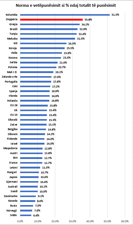 Shqipëria mungon në të dhënat e Forumit, por INSTAT raporton që 35.8% e totalit të të punësuarve në vend janë të vetëpunësuar, duke na renditur në vend të dytë në botë pas Kolumbisë.