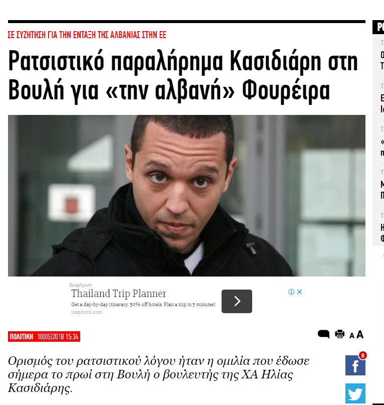 Konkretisht, Kasidiaris ka thënë se “e shikoni kush janë shqiptarët? Merrni rastin e Eurovisionit, reklamojmë një këngëtare që nuk thoshte se ishte shqiptare, e të gjithë këta lamashët futbollistë e këngëtarë sapo bëjnë para fillojnë të veshin bluzat e UCK, e të bëjnë simbolet e Shqipërisë së Madhe. Le të shkojnë aty ku ishin askushi e nuk kishin këpucë në këmbë. Asnjë bisedë për shqiptarët, asnjë negociatë, derisa të ndalojë politika antigreke e qeverisë shqiptare. Veto greke kërkon Agimi i Artë për të mos vijuar asnjë diskutim me sistemin Rama per integrim në BE”,- përfundoi delirin racist deputeti i Agimit të Artë sot në parlamentin grek. BW