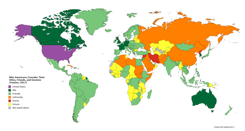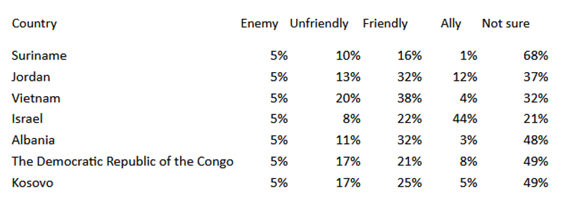 Sipas të dhënave të tjera, shtetet e konsideruara ‘armike” janë Koreja e Veriut, Irani dhe Siria. Ndërsa shtetet me 0 % si armiq janë Madagaskari, Australia dhe Paraguaji.