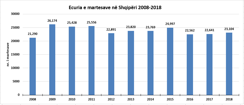 Në publikim janë llogaritur martesat e hershme për vajzat dhe djemtë në mosha teke, për grupmoshën 15-19 vjeç. Numri i vajzave të martuara para moshës 18 vjeç, gjatë vitit 2018, është 24, raporton INSTAT. Ky numër është ulur në krahasim me një vit më parë, kur u regjistruan 38 martesa të vajzave nën 18 vjeç.