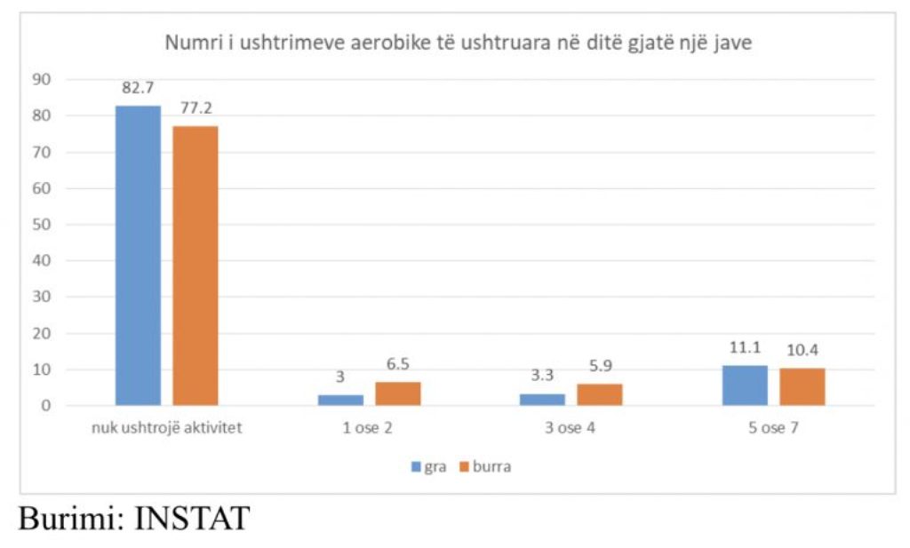 Por, të tjera të dhëna që lidhen me aktivitetin fizik të ushtruar, tregojnë se burrat shqiptarë ushtrohen më rregullisht se gratë.