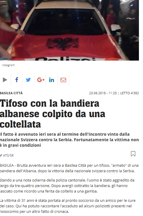 Një ngjarje e rëndë ka ndodhur në Bazel të Zvicrës, ku një shqiptar ka mbetur i plagosur me thikë. Incidenti është shënuar pas festimeve që rendën pas fitores së Zvicrës përballë Serbisë, ku dy shqiptarët Xherdan Shaqiri dhe Granit Xhaka bënë dy gola. Mediat italiane raportojnë se tifozi shqiptar ishte duke festuar me një flamur shqiptar, kur është sulmuar me thikë nga 3-4 persona. /ma.me