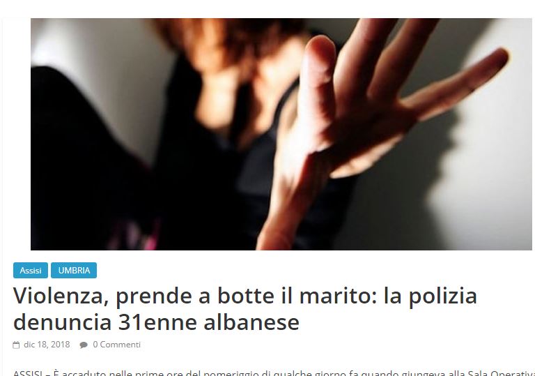 Një 31-vjeçare nga Shqipëria e varur nga alkooli e cila dhunonte barbarisht bashkëshortin e saj italian, 45-vjeç, është proceduar penalisht në gjendje të lirë nga policia italiane. Shqiptarja 31 vjeç, identiteti i të cilës ende nuk bëhet i ditur, është kapur duke goditur në gjendje të dehur burrin e saj italian. Është dashur ndërhyrja e karabinierëve italiane që ta ndajnë sherrin, ndërsa burri i saj italian nxirrte edhe gjak nga hundët dhe mbeti me plagë të rënda në kokë.
