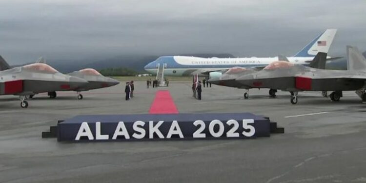Një tapet i kuq është shtruar në formë L-je që udhëheqësit të ecin drejt një platforme që është etiketuar si “ALASKA 2025”. Një mal i mbuluar me re në sfond plotëson tablonë.