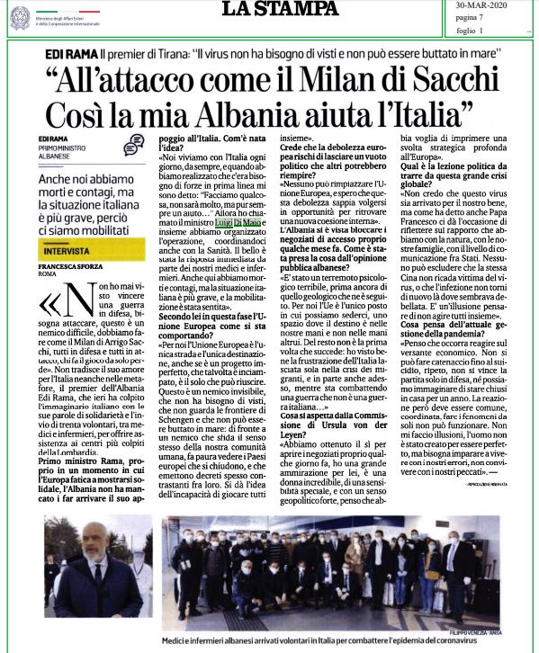 ”Nuk e tradhton dashurinë e tij për Italinë edhe te metaforat kryeministri i Shqipërisë, Edi Rama, i cili dje goditi imagjinatën italiane me fjalët e tij të solidaritetit dhe dërgimin e 30 vullnetarëve, përfshirë mjekë dhe infermierë, për të ofruar ndihmën për qendrat më të prekura në Lombardi”, shkruan ‘La Stampa”.
