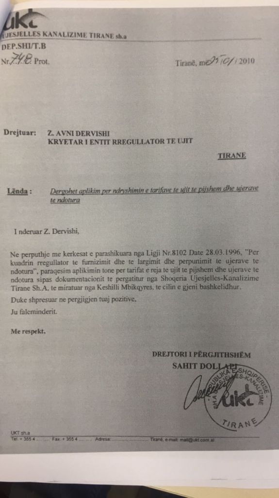 Përmes një shkrese zyrtare, në 5 janar të vitit 2010, Dollapi do të paraqite kërkesën për ndryshim të tarifave të ujit të pijshëm duke propozuar rritje të saj nga 20 lek/ m3 në 40 lek/ m3, pra dyfishim të saj për abonentët familjarë. Kujdesin më të madh në propozimin për rritjen e çmimit të ujit të pijshëm të djathtët e treguan për bizneset. Çmimin e ujit të pijshëm për bizneset të djathtët e propozuan nga 95 lek /m3 në 120 lek. Brenda po këtij viti, me shpejtësi rekord, kërkesa do të miratohej dhe nga Enti Rregullator i Ujit duke miratuar tarifën zyrtare 33 lek/ m3.