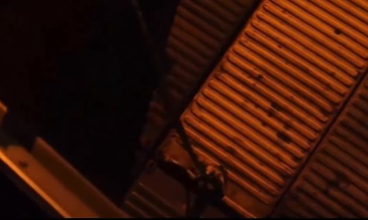 Videoja tregon helikopterë që fluturojnë mbi anijen e mallrave dhe një pamje nga lart të kontejnerëve metalikë që ndodhen poshtë, me një person që bie drejt tyre nëpërmjet një litari.