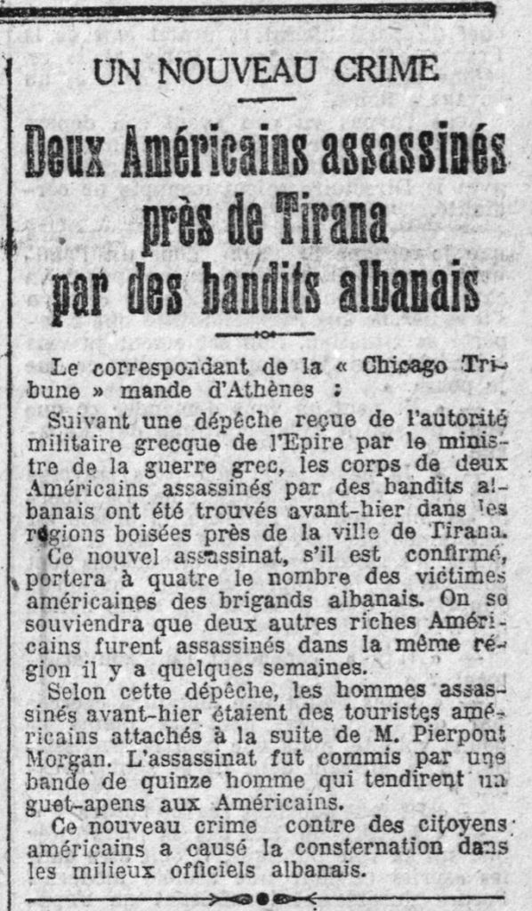 Sipas një shkrese të marrë nga autoriteti ushtarak grek i Epirit drejtuar ministrit grek të luftës, trupat e dy amerikanëve të vrarë nga banditët shqiptarë u gjetën një ditë më parë në zonat e pyllëzuara pranë qytetit të Tiranës.