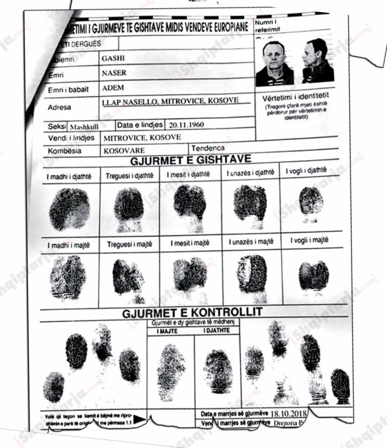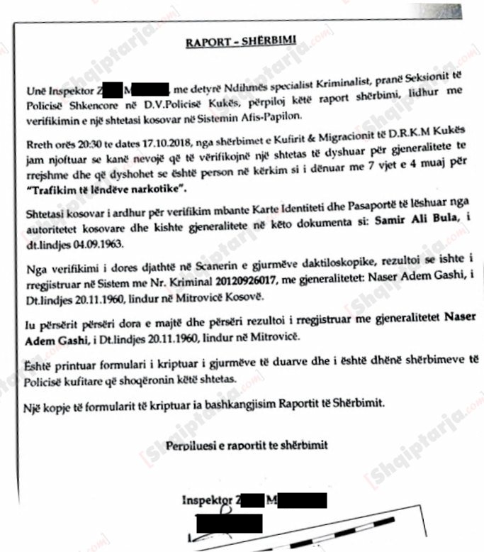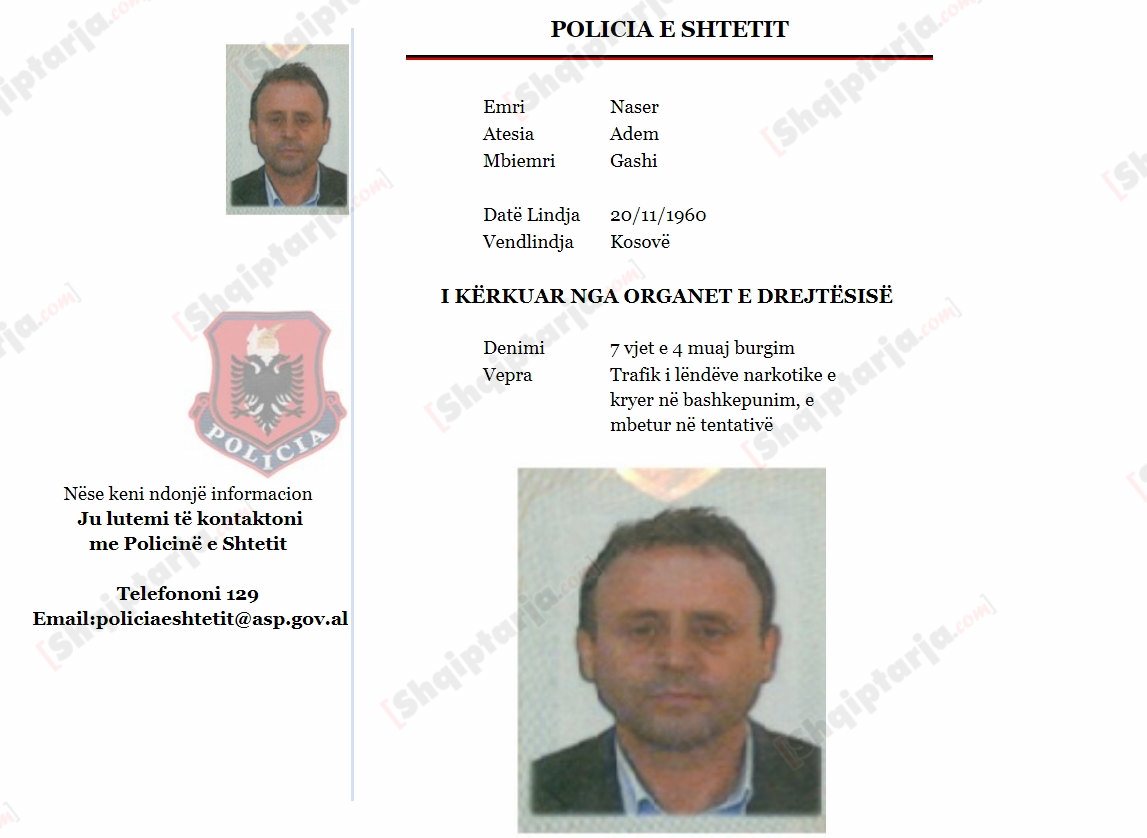 Gjatë verifikimeve të kryera nga “Shqiptarja.com“ mësohet se kosovari Naser Gashi, i cili prej qershorit 2013 vijon të jetë person në kërkim ndërkombëtar pasi rezulton se me vendimin nr. 41 të datës 13 qershor 2013 është dënuar me 11 vite burg për akuzën e “Trafikut të lëndëve narkotike” kryer në bashkëpunim. Për shkak të gjykimit të shkurtuar, Gashi ka përfituar ulje dënimi duke u dënuar përfundimisht me 7.4 vite burgim. Gashi është orvatur të marrë pafajësi në Gjykatën e Lartë, por çështja e tij nuk është pranuar të gjykohet, duke lënë në fuqi dënimin e dhënë nga Apeli i Krimeve të Rënda. Gashi ka qëndruar në arrati duke u fshehur nën identitetin e shtetasit Kosovar Saimir Buli, ku me këtë emër ka hyrë disa herë në Shqipëri. Por në mbrëmjen e 17 tetorit 2018, Gashi së bashku me shokun e tij Ron Nimani, kanë tentuar të dalin nga Shqipëria në Kosovë, me një makinë Audi duke përdorur pikën e kalimit kufitar Morinë. Pikërisht në këtë pikë kufitare, ata i janë nështruar kontrolleve, ku Gashi ka paraqitur dokumenta identifikuese me emrin Saimir Bula. Si pasojë e dyshimeve të ngritura mbi këto dokumenta, është vendosur nga policia kufitare që kosovari të shoqërohet në Drejtorinë e Policisë Kukës, ku t’i nënshtrohet identifikimit nëpërmjet gjurmëve të gishtave.