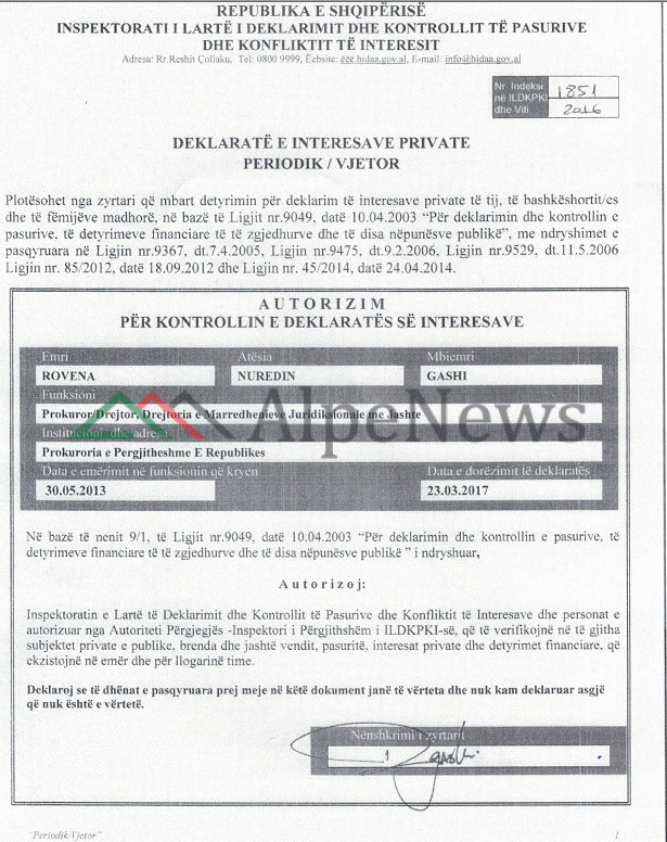 Nuredin Gashi, siç mund ta shihni edhe tek kjo shkresë këtu poshtë, është babai i Rovena Gashit, krahut të djathtë dhe bashkëpunëtores më të afërt të ish Kryeprokurorit Adriatik Llalla, familjes së të cilit i është ndaluar hyrja në SHBA për shkak se siç tha sekretari Amerikan i Shtetit Rex Tillerson ai është përfshirë në raste të mëdha të korrupsionit në detyrë.