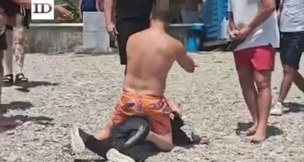 Në njërën nga videot, një burrë me rroba banje duket se ka hedhur një burrë në tokë, ndërsa emigranti duket se po i lutet atij ta lërë të shkojë.