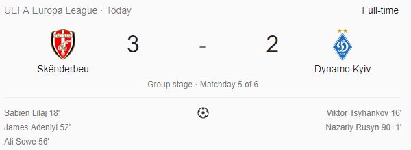 Skënderbeu ka shijuar fitoren e parë në Europa League, pasi e mposhti 3:2 Dinamon e Kievit.