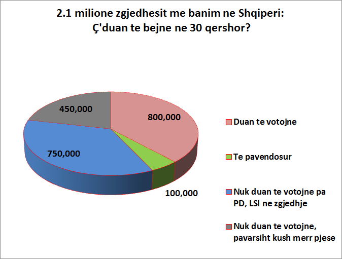 Rreth 36% e të anketuarve u përgjigjen se nuk duan të votojnë, meqë PD, LSI, etj. nuk marrin pjesë në zgjedhje. Me ekstrapolim, i bie që rreth 750 mijë zgjedhës me banim në Shqipëri futen në këtë kategori. Për krahasim, rreth 770 mijë votuan për PD, LSI, PDIU e PR.