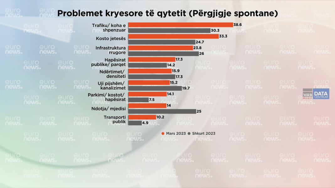 Trafiku dhe koha e shpenzuar në kryeqytet është renditur si problematikë kryesore në Tiranë. 38.6% e qytetarëve mendojnë që kjo është problematikë kryesore. Ky perceptim i kryeqytetasve, është rritur nga muaji shkurt deri në mars me 8.3%.