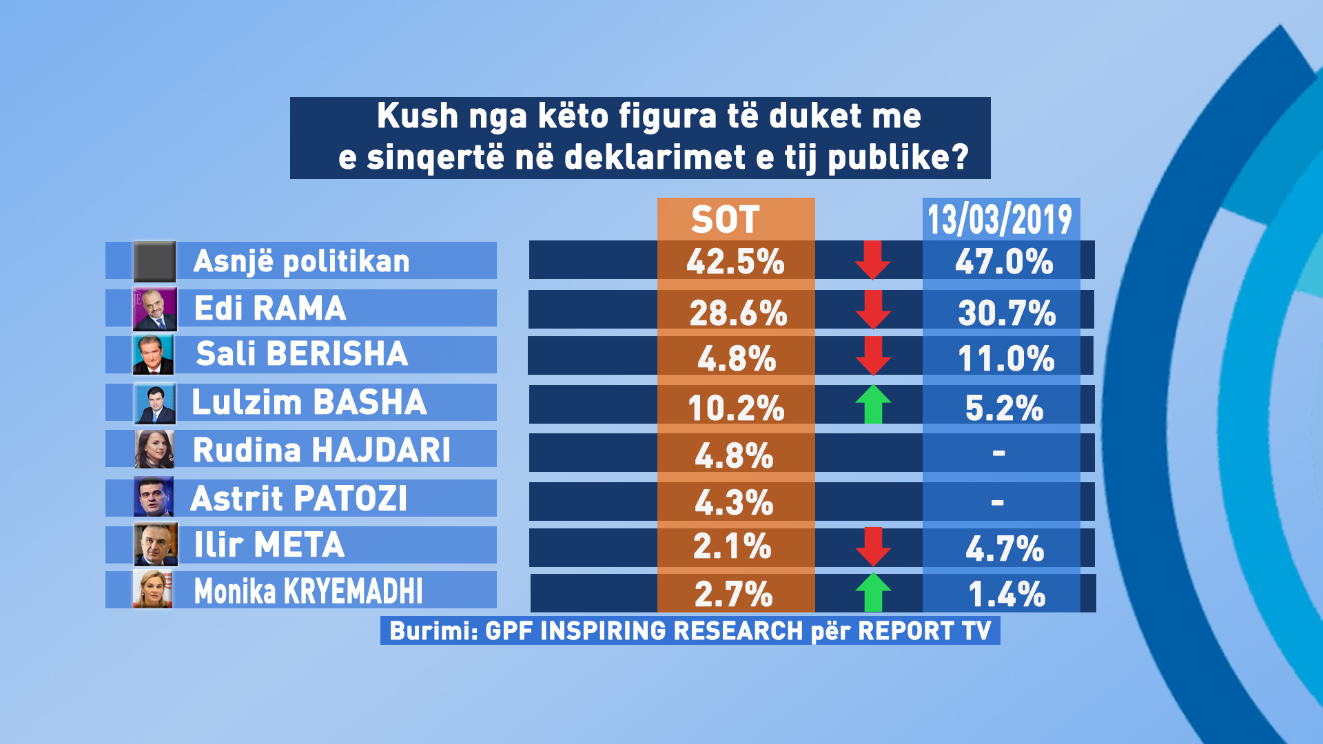 Shqiptarët e intervistuar nga GPF Inspiring Research, janë përgjigjur duke thënë se më i sinqertë në deklarimet publike duket kryeministri Edi Rama, me 42.5 %, pas tij ish-kryeministri Sali Berisha me rreth 29 %, Lulzim Basha vetëm me 10,2 %, ndërsa bie në sy se 4.8 % e përgjigjeve janë edhe për deputeten Rudina Hajdari, kryetare e grupit parlamentar demokrat.