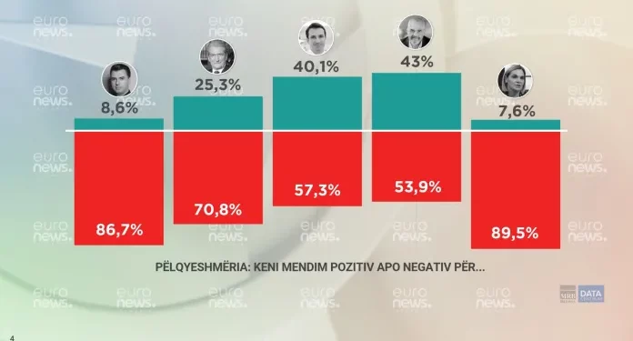 Për qytetarët e Tiranës, liderët politik që perceptohen më negativisht janë kryetarja e LSI, Monika Kryemadhi (89,5%) dhe Lulzim Basha (86,7%). 71% e qytetarëve të Tiranës kanë mendim negativ për ish kryeministrin Sali Berisha.