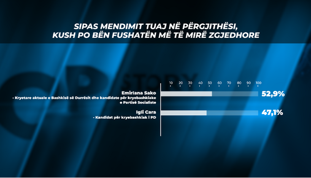 Nëse zgjedhjet do të ishin nesër, qytetarët e Durrësit vazhdojnë të mbështesin Emirjana Sakon, edhe pse me 0.3% më pak në lidhje me sondazhin e parafundit. 53.9% e tyre janë shprehur se do të mbështesin Sakon ndërsa pjesa tjetër, pra 46.1 tregojnë se preferojnë Carën.