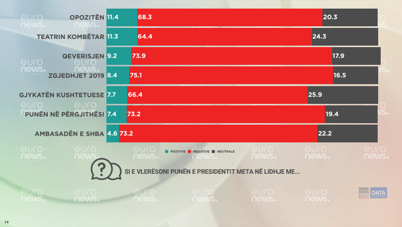 Po ashtu Meta vlerësohet negativisht edhe për qëndrimin e tij në lidhje me Gjykatën Kushtetuese nga rreth 66% e qytetarëve. Vlerësim negative marrin edhe qëndrimet e tij për Teatrin Kombëtar (64,4%), ndaj ambasadës amerikane (73%) dhe zgjedhjet lokale të 2019-ës (75%).