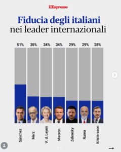 Qëndrimi i qeverisë spanjolle ndaj Shteteve të Bashkuara, politikat progresiste në fushën e punës dhe emigracionit, si dhe refuzimi për të rritur shpenzimet ushtarake pavarësisht kërcënimeve të Donald Trump, janë disa nga arsyet pse kryeministri spanjoll Pedro Sánchez gëzon nivelin më të lartë të besimit mes votuesve italianë. Pas kërcënimeve të tjera nga Uashingtoni për çështjen e bazave ushtarake në Andaluzia, qeveria spanjolle ka kundërshtuar gjithashtu në mënyrë të fortë operacionin ushtarak të SHBA-së dhe Izraelit kundër Iranit.