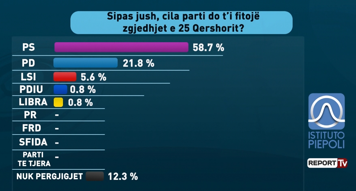 Referuar pyetjes se kush do t’i fitojë zgjedhjet, 58.7 % e të intervisstuarve janë përgjigjur se do të jetë PS, 21.8 % janë përgjigjur PD dhe 5.6 % janë përgjigjur se do fitojë LSI.