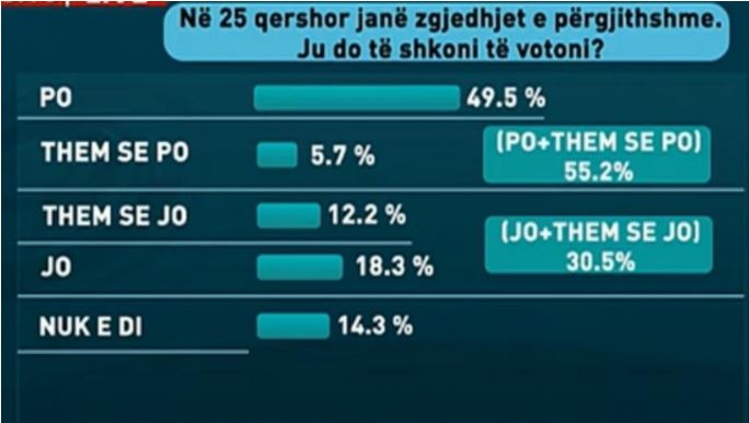 Një prej pyetjeve ku u përqendrua sondazhi ishte edhe pjesëmarrja në votime. 55.2 % e qytetarëve të intervistuar janë përgjigjur se do të merrnin pjesë në votime./a.m.