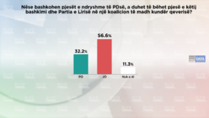 Janë 56,6 % që janë përgjigjur jo kësaj pyetje duke shprehur kundërshti me bashkimin e partise së lirisë me Partinë Demokratike në një front opozitar, dhe 32,2 % që janë dakord me idenë e bashkimit të Partisë së Lirisë me PD në një front opozitar. 11.3 % janë përgjiggjur nuk e di në këtë pyetje./m.j
