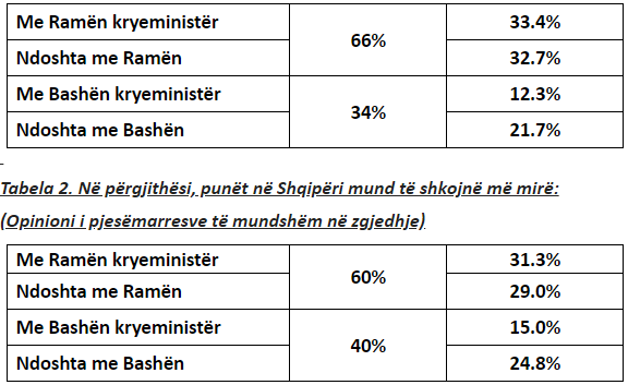 Duke përdorur një model Logistic Regression, llogarita se sa ishte probabiliteti që secili i anketuar të marrë pjesë në zgjedhjet e ardhshme, kurdo që të zhvillohen ato. Dhe bazuar në rezultatet e modelit, ekstrapolova se rreth 1.65 milionë banorë aktualë të Shqipërisë e kanë mbi 50% probabilitetin për të marrë pjesë në zgjedhjet e ardhshme, kurdo që të zhvillohen ato. Në Tabelën 1 më poshtë paraqitet opinioni i tyre rreth pyetjes së mësipërme. Ndërsa në Tabelën 2 paraqitet opinioni i tyre se me cillin nga dy politikanët në krye të qeverisë mund të shkojnë më mirë punët në Shqipëri.