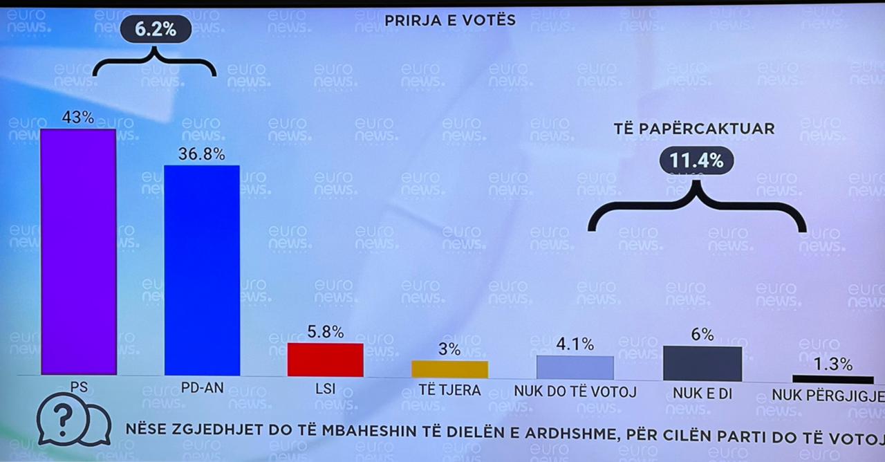 Sondazhi i Euronews Albania jep sërish një prirje të votuesit shqiptar drejt PS-së me 43 % ,