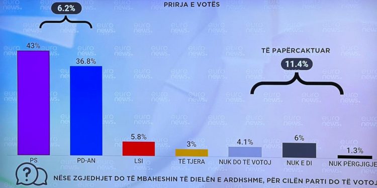 Sondazhi i Euronews Albania jep sërish një prirje të votuesit shqiptar drejt PS-së me 43 % ,