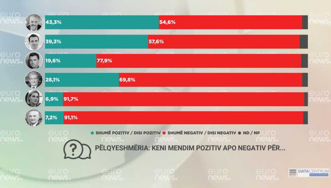 Ky është rezultati i vrojtimit të Barometrit të Euronews për matjen e pëlqyeshmërisë së gjashtë udhëheqësve kryesorë politikë të vendit, Edi Rama, Erion Veliaj, Lulzim Basha, Sali Berisha, Ilir Meta dhe Monika kryemadhi.