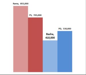 Duke i krahasuar këto shifra me të një sondazhi që zhvillova javën e parë të gushtit mbi partitë, rezulton se Rama ka 150 mijë simpatizantë më shumë se sa ka vota PS-ja, ndërsa Basha ka 120 mijë simpatizantë më pak se sa ka vota PD-ja (Shihni grafikun 1).